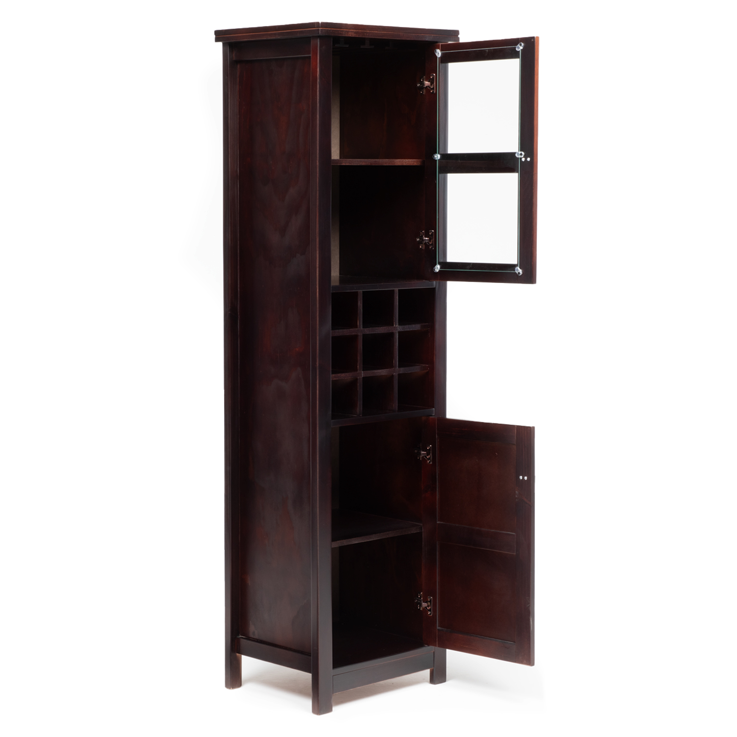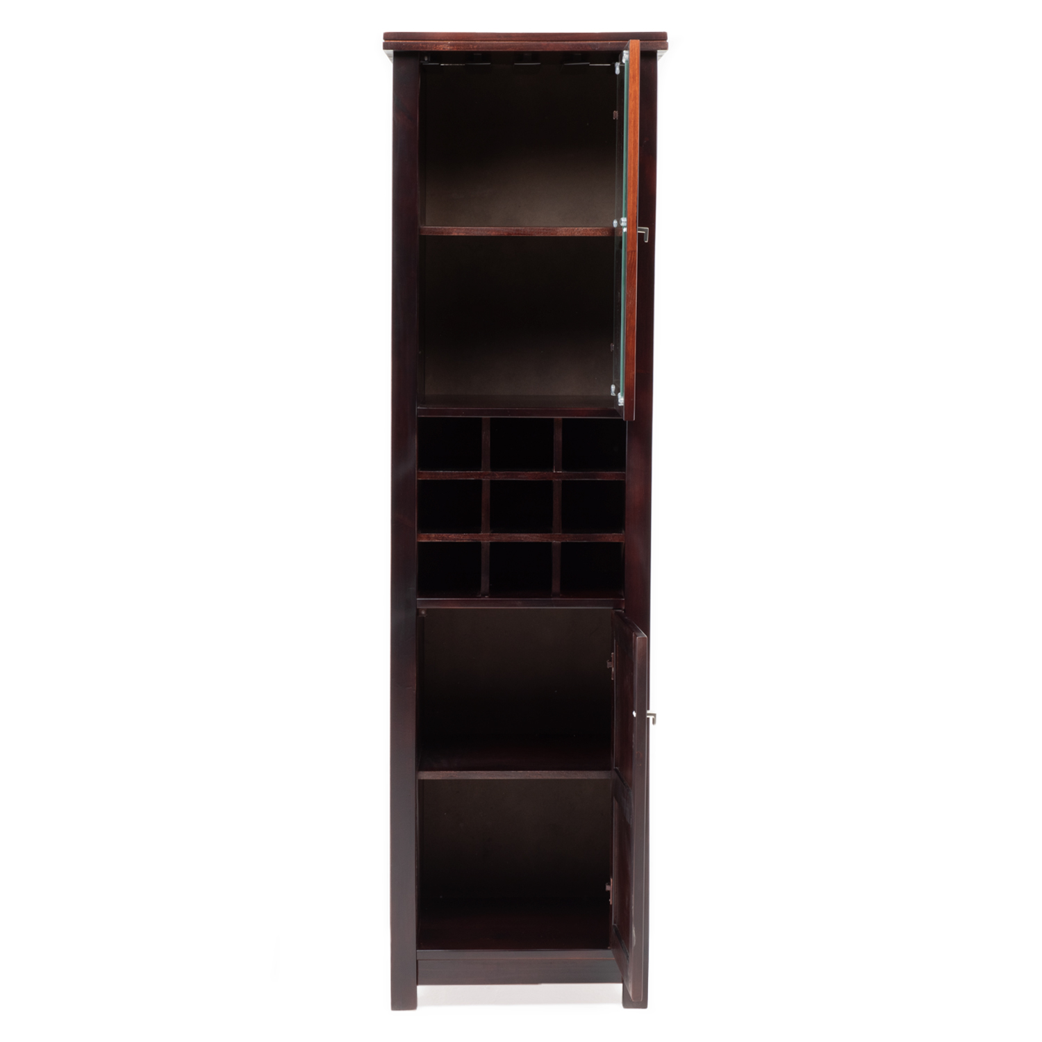 El bar Malaga posee diversos compartimientos para ordenar y mantener tus vinos, licores y elementos complementarios a tu bar como cocteleras, abridores de botellas, bombillas y posavasos. Tiene una sección para colgar copas en la parte superior, minimizando el riesgo de quebrarlas; otra en la parte inferior para guardar botellas de vino o licores de manera horizontal dos puertas.