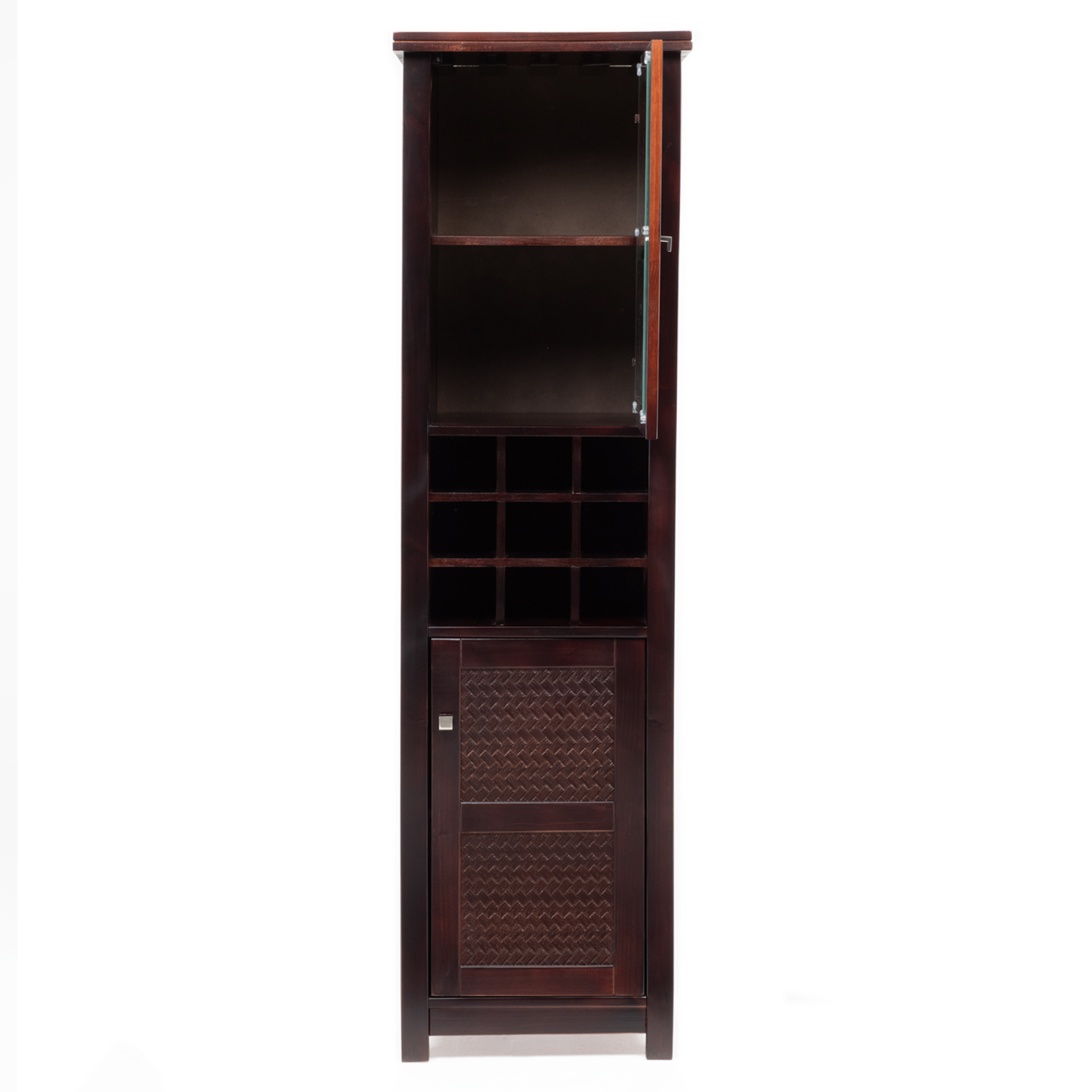 Mueble Bar de 1 cuerpo, con diseño moderno. Incluye 2 puertas, repisas, copero y espacio para botellas. Puerta con aplicación detalles decorativos en madera con textura ratán.