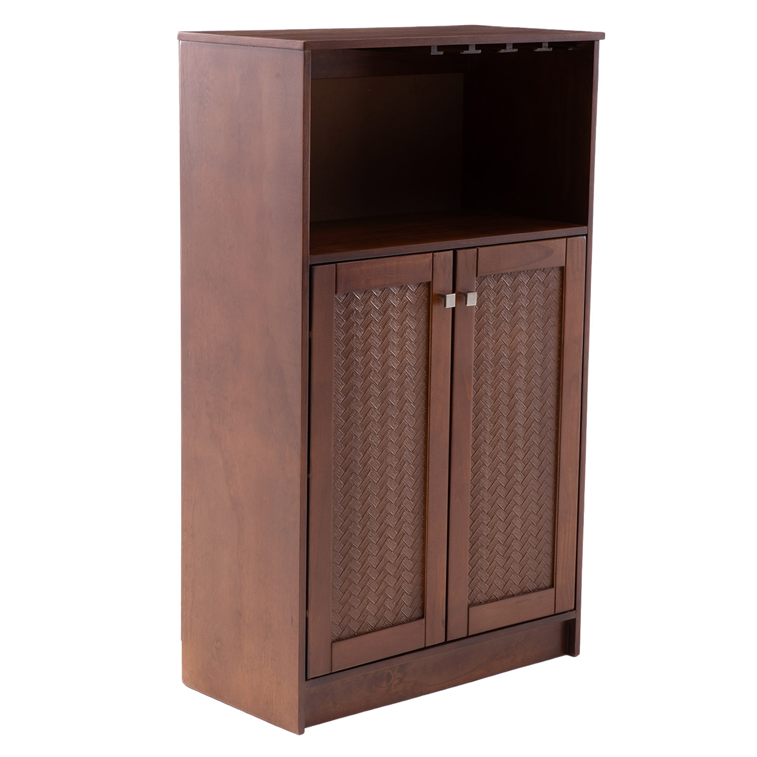 Mueble Bar de 1 cuerpo, con diseño moderno. Incluye 2 puertas, repisas, cajón, copero y espacio para botellas. Puerta con aplicación detalles decorativos en madera con textura ratán.