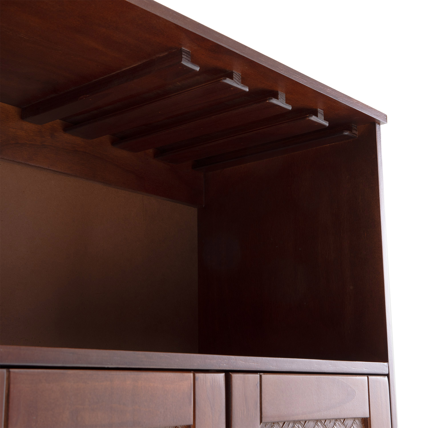 El bar Sofia color canela posee diversos compartimientos para ordenar y mantener tus vinos, licores y elementos complementarios a tu bar como cocteleras, abridores de botellas, bombillas y posavasos. Tiene una sección para colgar copas en la parte superior, minimizando el riesgo de quebrarlas; otra en la parte inferior para guardar botellas de vino o licores de manera horizontal dos puertas.