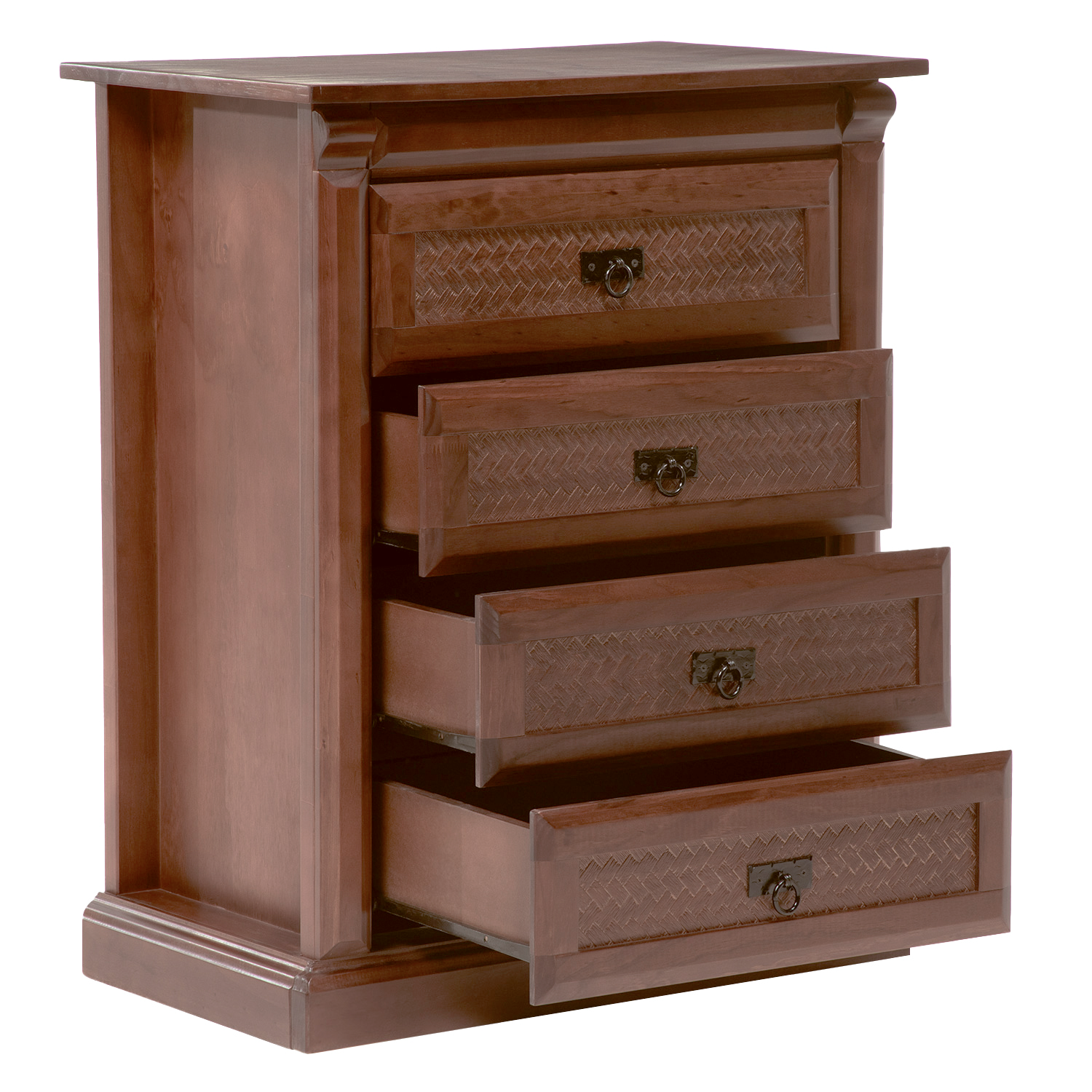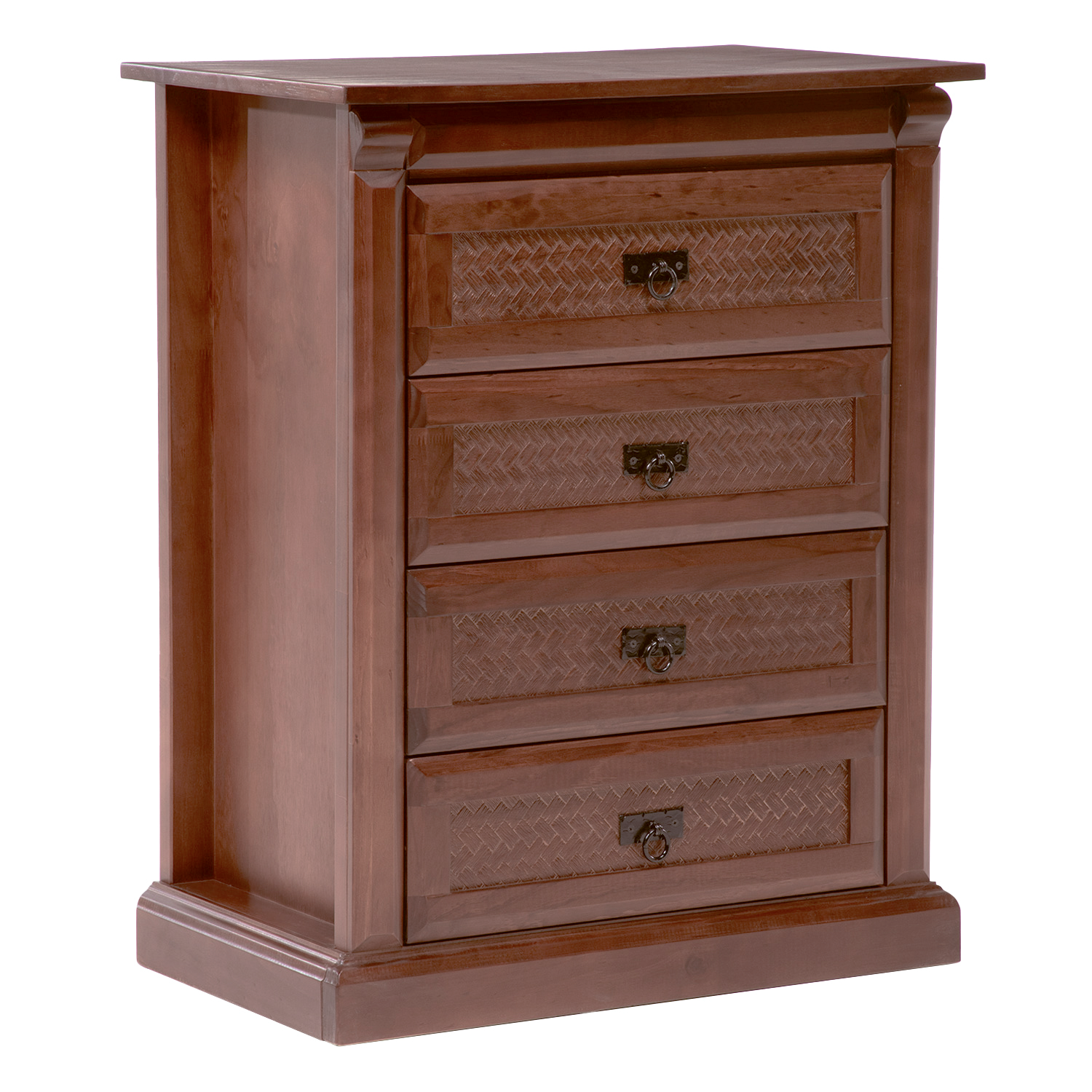 La Cajonera New Malaga es un mueble de dormitorio fabricado en una estructura de madera de pino, la cual ofrece resistencia y durabilidad, con su acabado y con detalle de textura ratán es ideal para quienes buscan tener un dormitorio con diseño elegante y clásico.