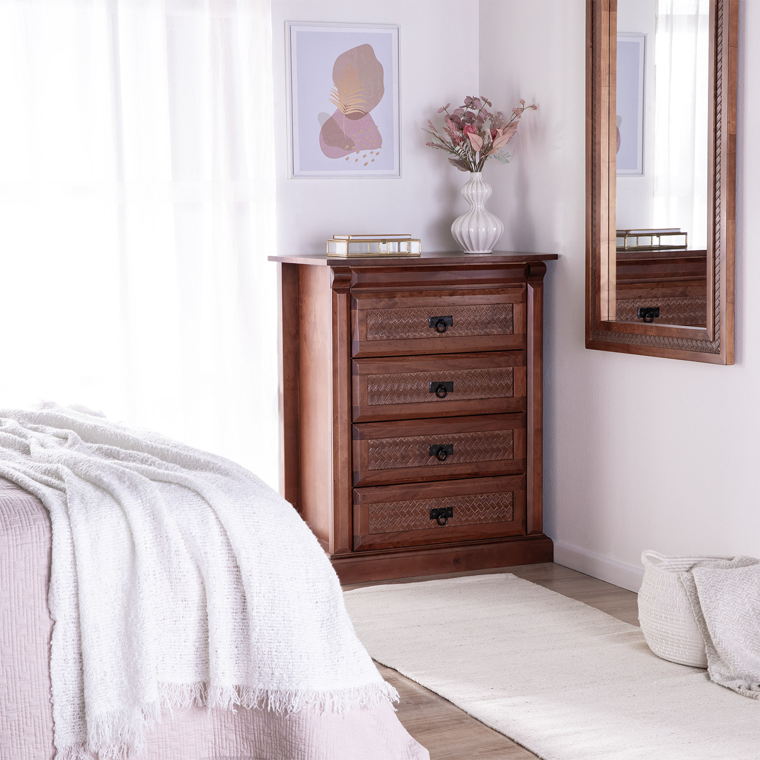 La Cajonera New Malaga es un mueble de dormitorio fabricado en una estructura de madera de pino, la cual ofrece resistencia y durabilidad, con su acabado y con detalle de textura ratán es ideal para quienes buscan tener un dormitorio con diseño elegante y clásico.