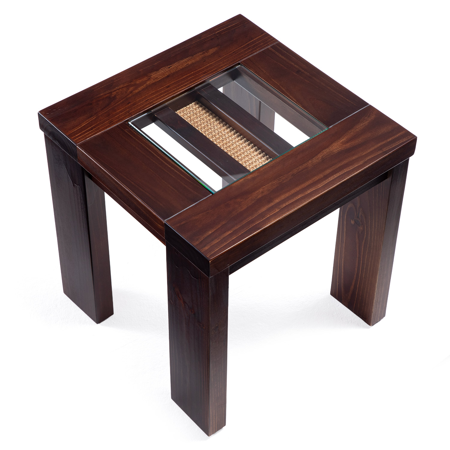 Mesas de gran calidad y diseño, con cubierta enmarcada en madera, centro de vidrio y franja central con aplicación de tejido sisal natural.