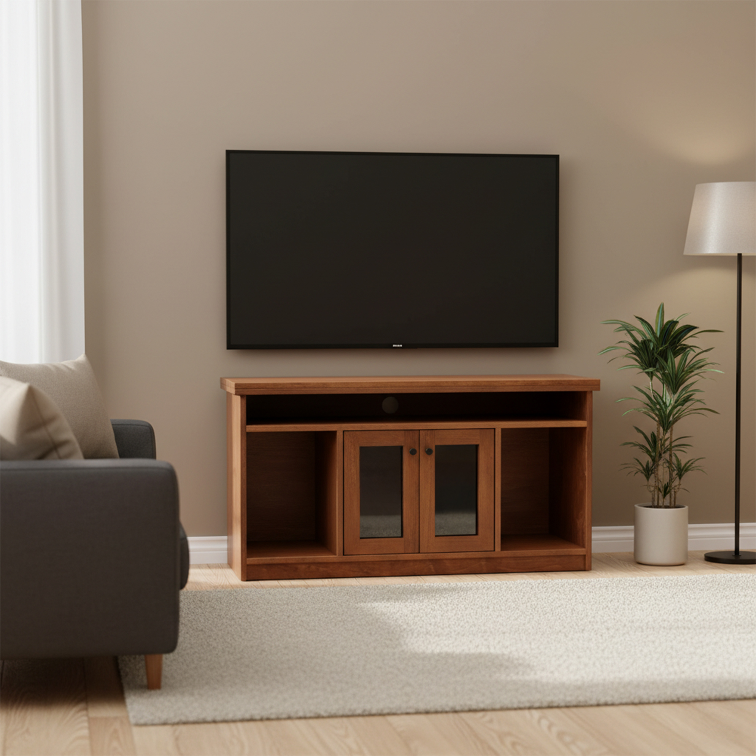 Mueble Aparador con estilo minimalista. Incluye puertas vidriadas con tiradores metálicos. Permite organizar equipos de TV, Audio, Consolas y otros. Fabricado en madera sólida de pino radiata.