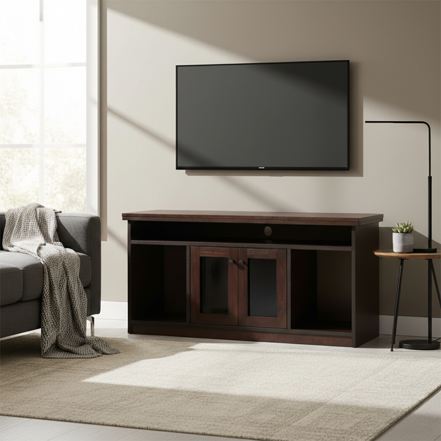 Mueble Aparador con estilo minimalista. Incluye puertas vidriadas con tiradores metálicos. Permite organizar equipos de TV, Audio, Consolas y otros. Fabricado en madera sólida de pino radiata.