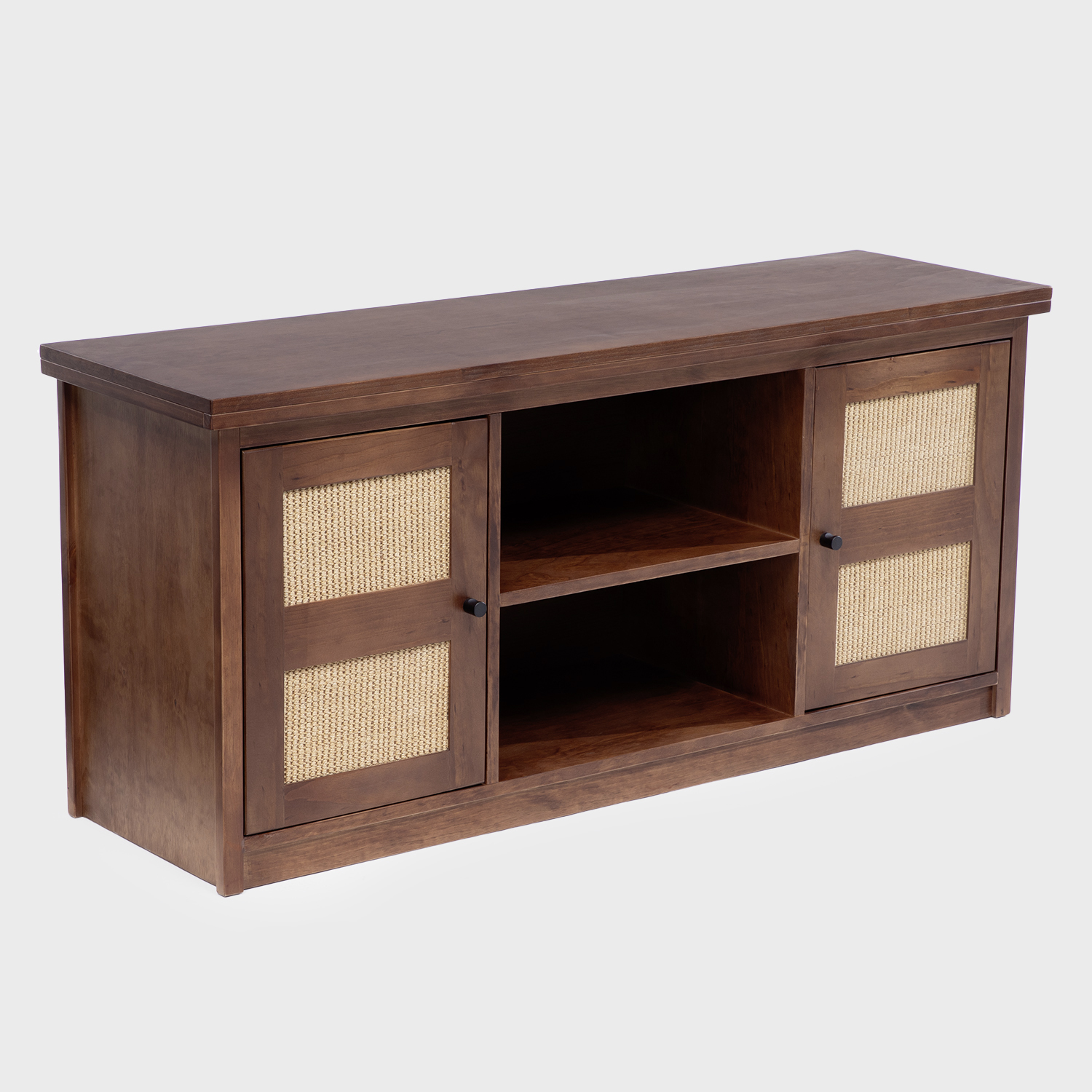 Mueble Aparador con diseño moderno. Incluye puertas con aplicación de Sisal Natural. Permite organizar equipos de TV, Audio, Consolas y otros. Fabricado en madera sólida de pino radiata.