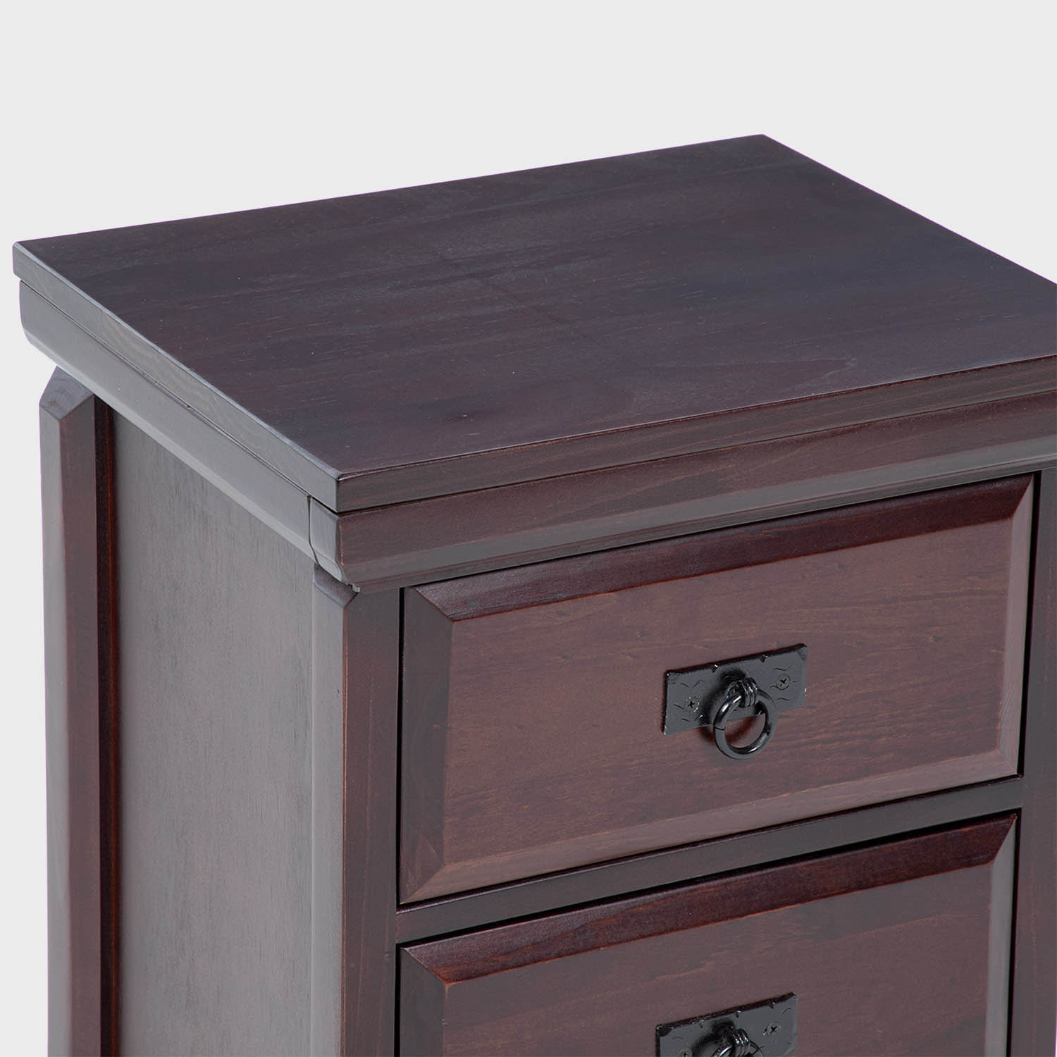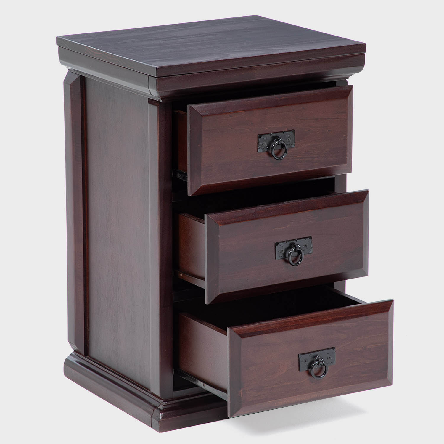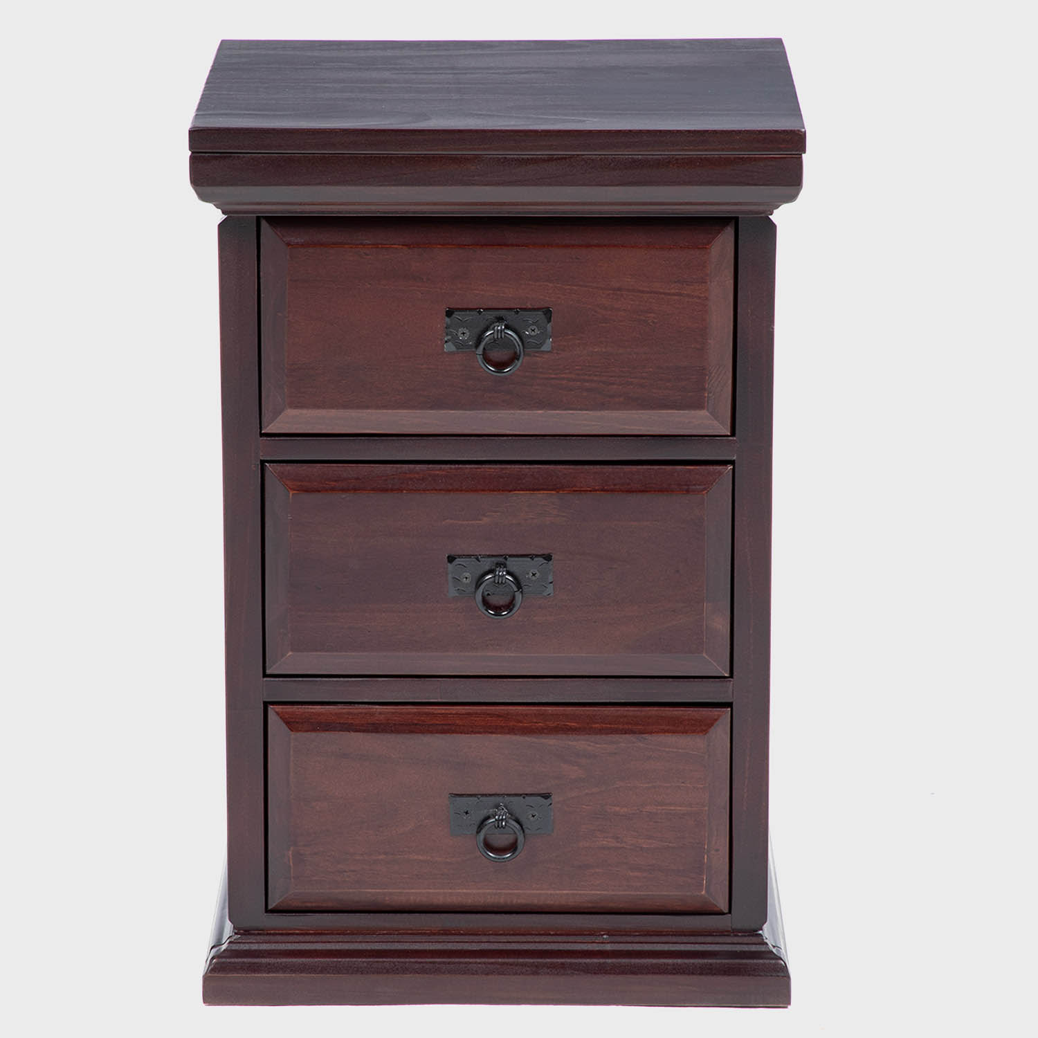 Velador alto, con estilo tradicional y de gran calidad, diseño elegante que destacará en cualquier dormitorio. Estructura sólida con 3 cajones con herrajería rústica y detalles trabajados en madera.