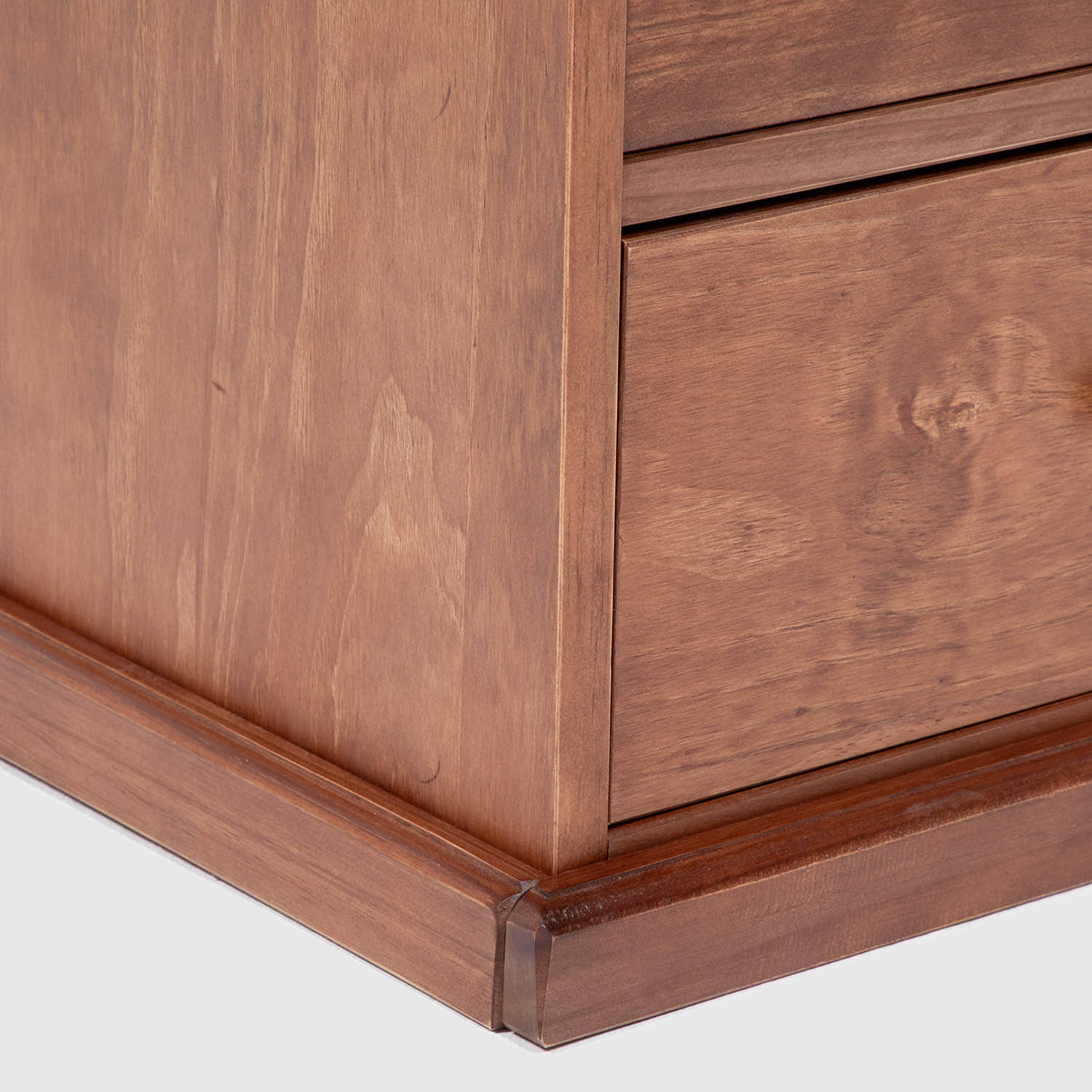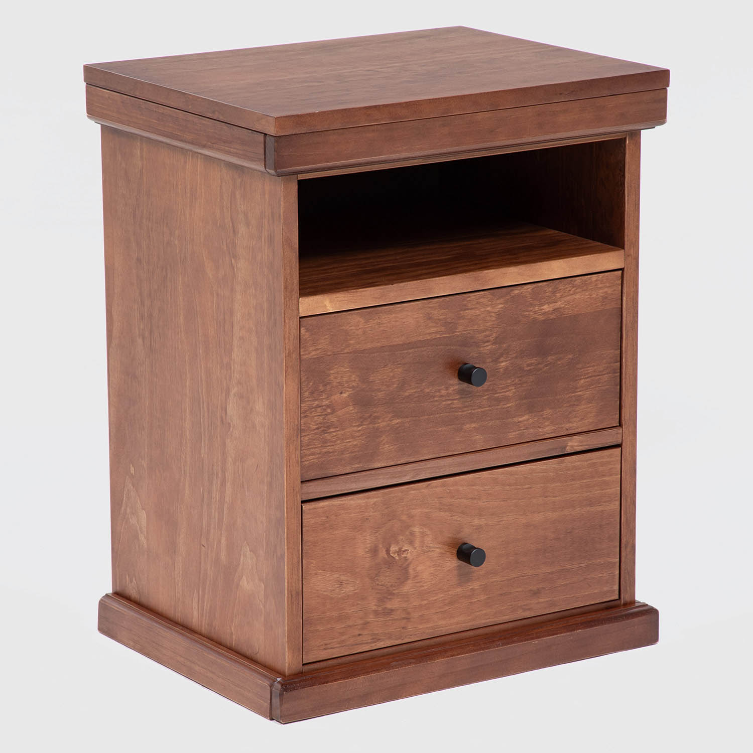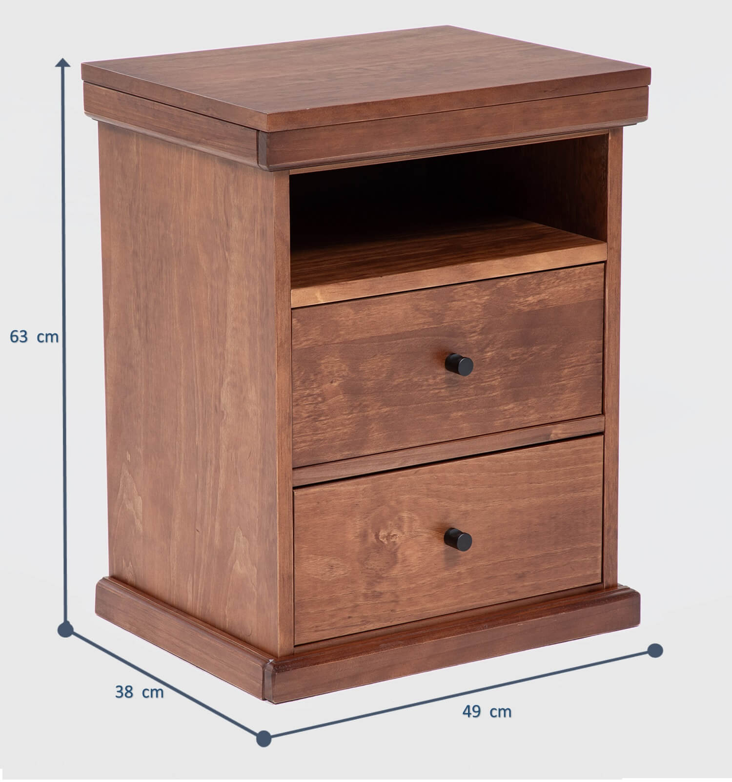 Velador alto con estilo tradicional. Incluye 2 cajones amplios con tiradores metálicos, espacio superior que otorga funcionalidad. Estructura de gran calidad, fabricada en madera sólida.